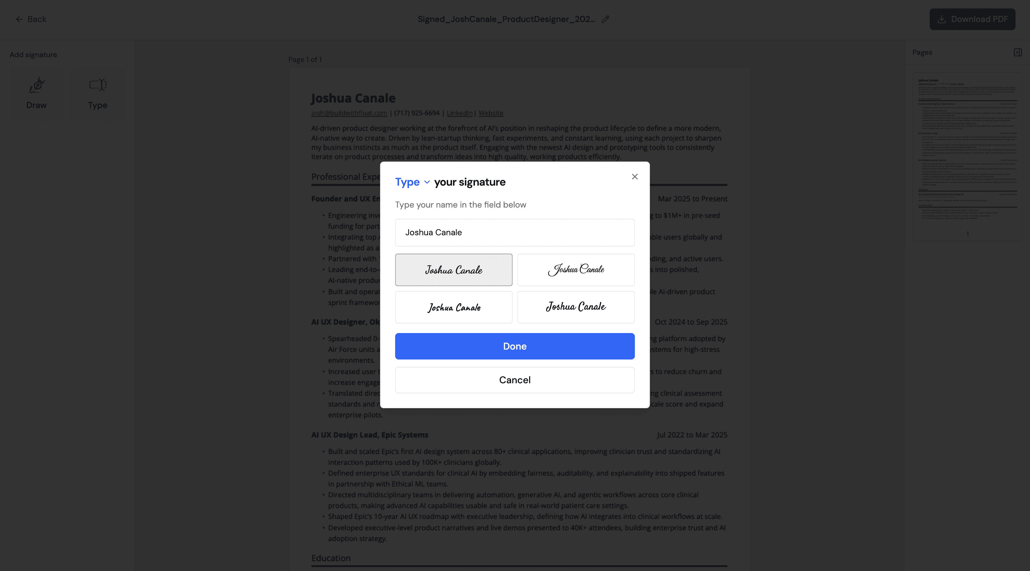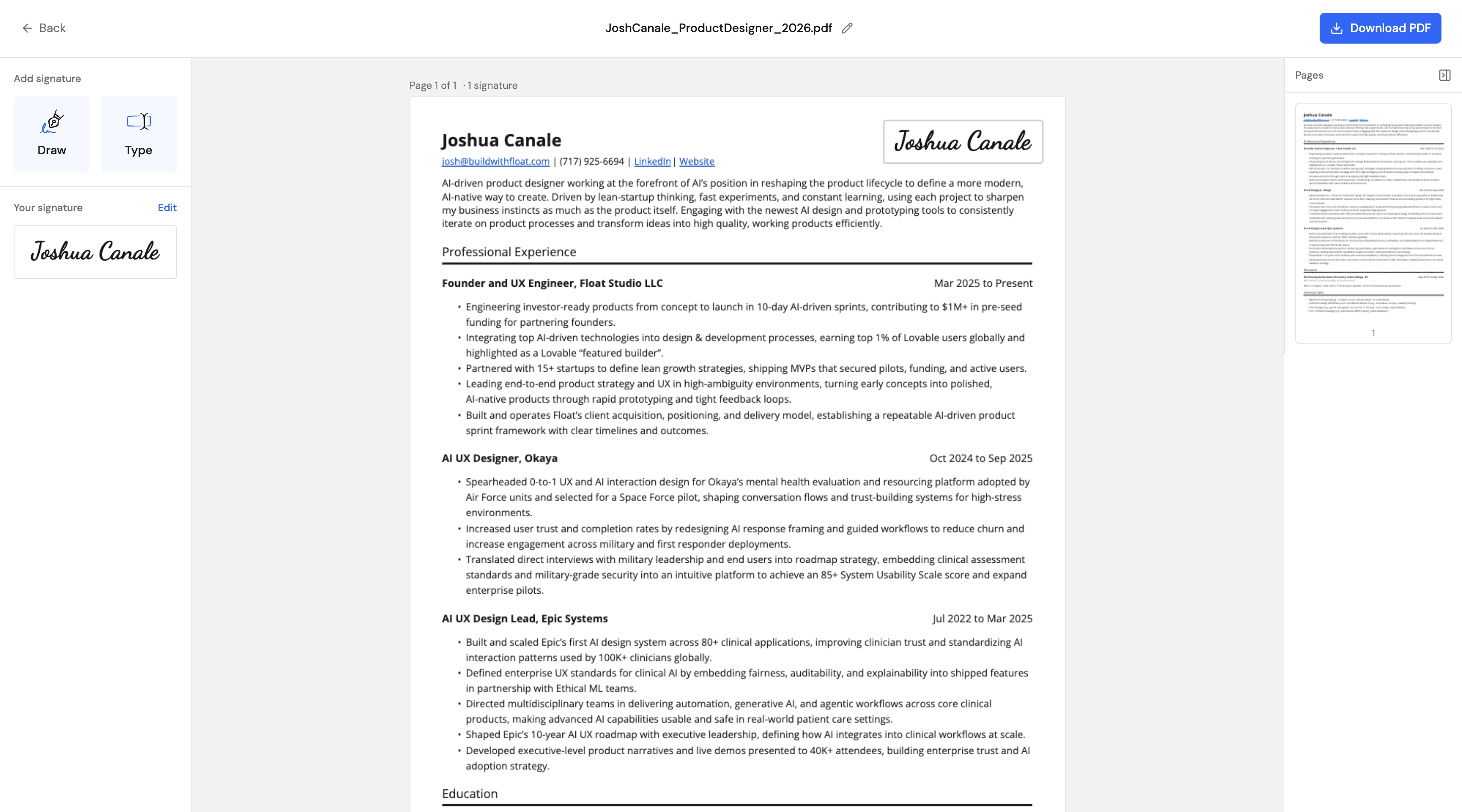 A simple SaaS tool for signing uploaded PDFs at no cost.