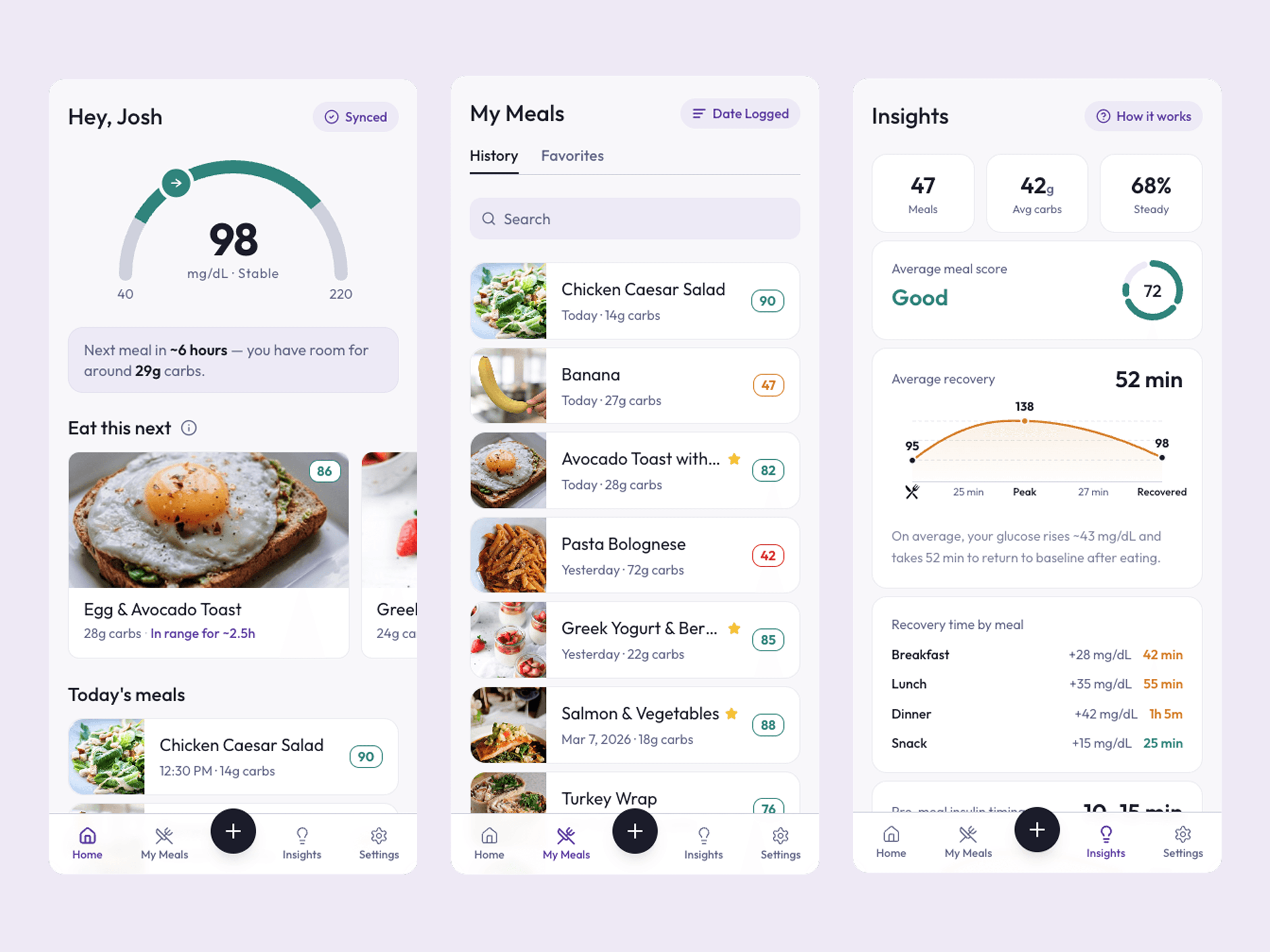 Shows how meals impact glucose trends